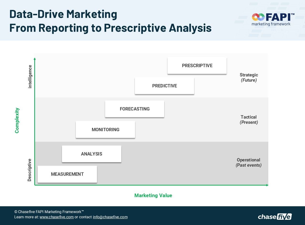 Modern marketing teams sit on a mountain of data, yet turning that data into meaningful decisions remains a challenge. The FAPI Marketing Framework™ offers a clear path: move step by step from operational reporting to strategic prescriptive insights. The diagram below illustrates this progression, showing how marketing intelligence evolves in both complexity and value.