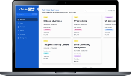 Proving marketing’s value shouldn't be guesswork. The Chasefive Marketing Manager equips you with the tools to link your marketing activities to measurable business outcomes. Whether you're building a department from the ground up or looking to improve alignment across teams and channels